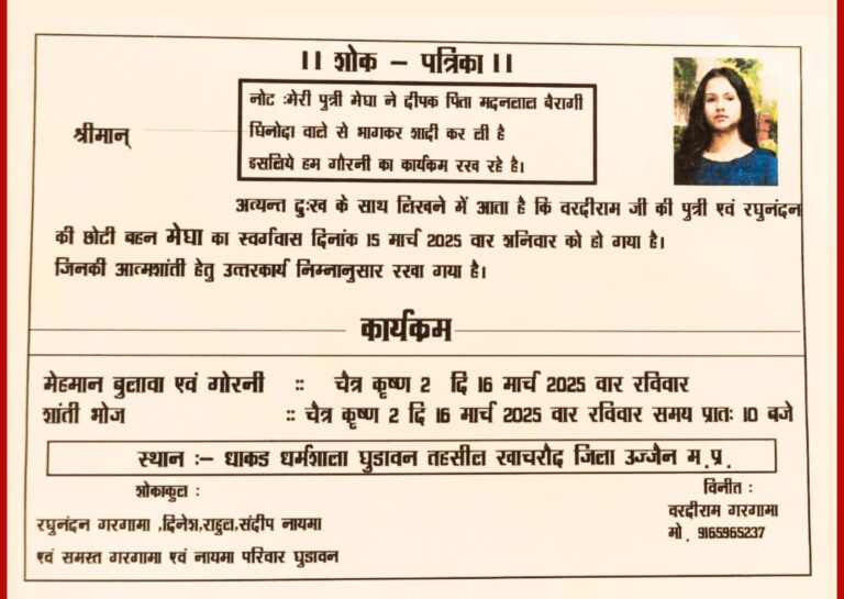 सिटी न्यूज़ Ujjain : जीते जी बेटी का पिंडदान! खाचरौद में परिवार ने शोक पत्रिका छपवाकर किया अंतिम संस्कार 17/03/2025